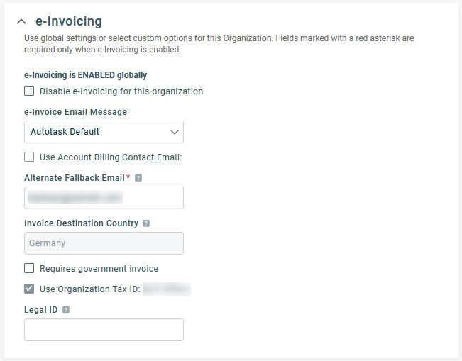 Select this checkbox if the organization is required to submit invoices through a government-mandated e-invoicing process. When enabled, Autotask will treat all invoices for the organization as requiring submission to the appropriate government or tax authority via the designated e-invoicing network (e.g., PEPPOL or a country-specific system).