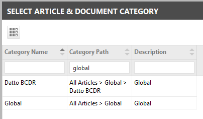 To keep global articles grouped together, we have created a Global article category inside of the All Articles category, and a Datto BCDR sub-category below that. You can easily apply the appropriate filter on the Advanced Search tab.
