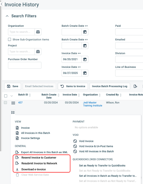 The Invoice History page will display the status of each e-invoice and allow for download or resubmission if needed.