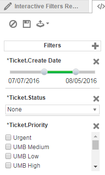 On this tab, you can set up simple interactive filters on data fields in the report. The user can apply these filters to the HTML report output after the report is generated. This allows you to create one report and publish it to the entire sales team, and each user the report is published to can then apply the pre-configured filters that show them data relevant to them.