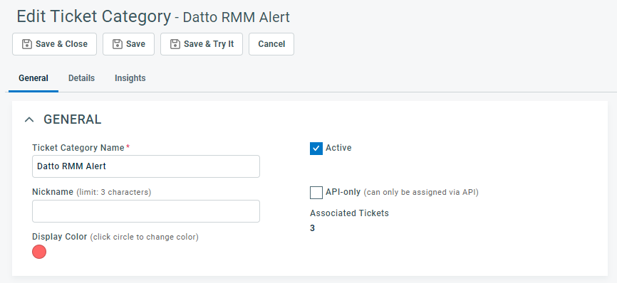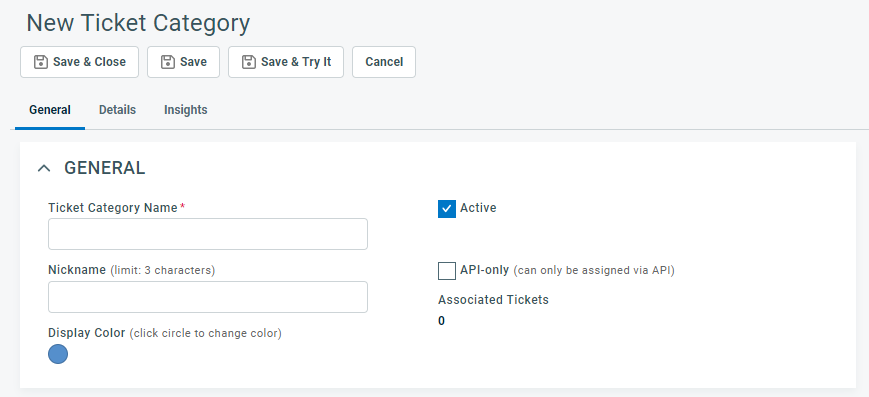 3. Complete the fields and settings on each of the three tabs: General, Details, Insights. Refer to