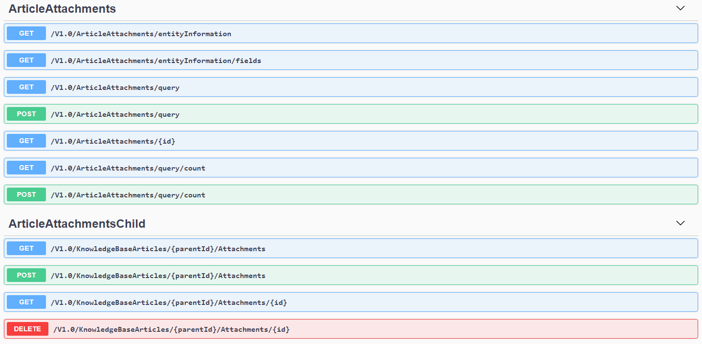 Some resources have child collections. To work with these collections, you will need to use their dedicated access URLs. To find out if an entity has child collections, access its entry in our Swagger instance and look for a Child entry under the entity's name, as shown in the screenshots below.