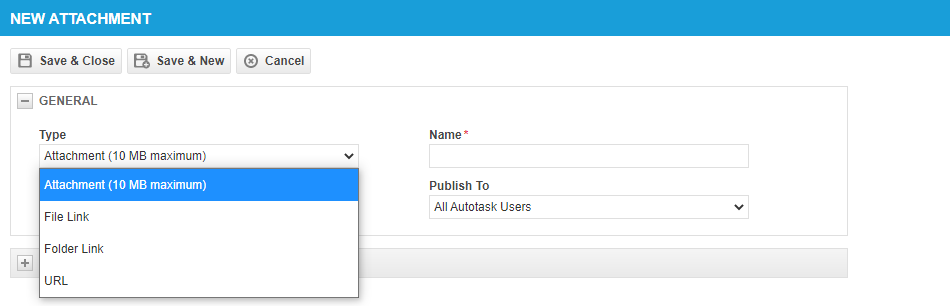 Attachments are external documents that are associated with one of the following entities. Attachments in Autotask can be documents uploaded to the server, file links, folder links, and URLs.