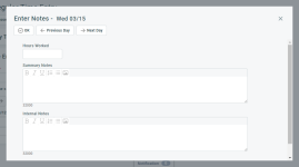 • If the Use the same Summary and Internal Notes for all days is cleared, the combined Summary Notes and Internal Notes fields do not appear. Instead, a note icon appears for each date. Click on the icon to open the Enter Notes dialog box for each date.
