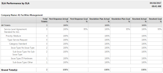 SLA hours are the hours, specified by the SLA, during which service is available to work towards meeting SLA goals. For example, SLA hours might be the same as regular business hours, or the SLA can set any arrangement of extended hours and even include holidays. This report calculates only time entered during the time frame specified by the SLA; it does not include time entered on SLA tickets outside of SLA hours. For example, If all work for any SLA objective occurs outside of the SLA hours, in this report total hours for that objective will display as 0. |