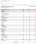 Number of open and closed tickets by Issue/Sub-Issue type over a specified date range. |