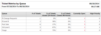 Various ticket metrics, sorted by queue, for tickets received in the selected date range. |