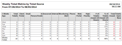Various ticket metrics, by day of the week, for the selected week. • Total Tickets show all tickets that were created that week • Total Closed includes all tickets from that week that were closed • Total Open Now include all tickets from this week that are still open