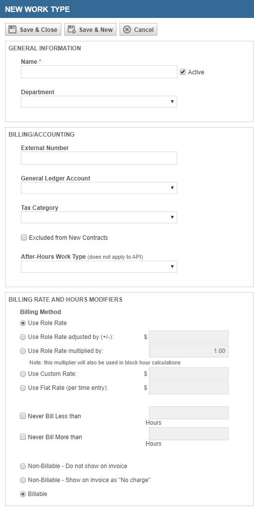 | Name (required) | Enter a unique name. TIP Best Practice: If your company uses both billable and non-billable work types of the same name, add (billable) and (non-billable) to the name to make it easier to identify the codes in the system. |