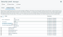 Run Reports in Designer | Users with this security level will see the folder in the LiveReports folder tree. They will be able to run, but not edit or delete the reports in this folder. NOTE This can give users access to reports that have not been published to them. |