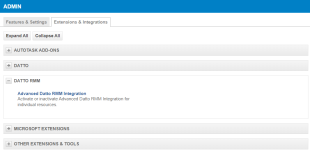 1. Navigate to Left Navigation Menu > Admin > Admin Categories > Extensions & Integrations > Datto RMM and click Advanced Datto RMM Integration.