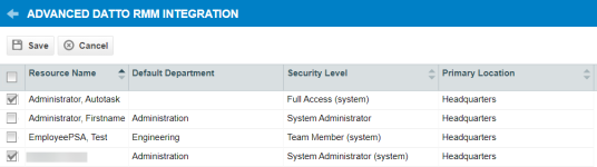 1. The Advanced Datto RMM Integration page lists all active resources. Select the check box next to the resource(s) for whom you would like to activate the integration. To enable access for all active resources, click the Select All check box in the header row.