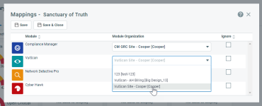 - On the Mappings - [Organization Name] page, select the appropriate Module Organization for each KaseyaOne module.